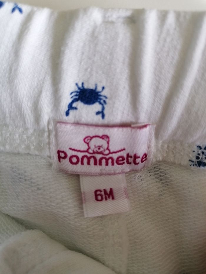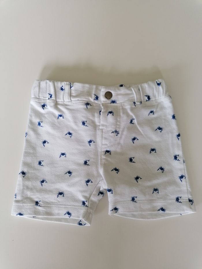 Short blanc avec motif crabe bleu Taille 6 mois Très bon état Acheté neuf Taille élastique avec fermeture pression Très souple donc agréable à porter pour bébé
