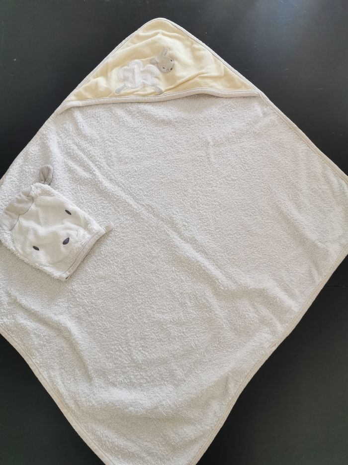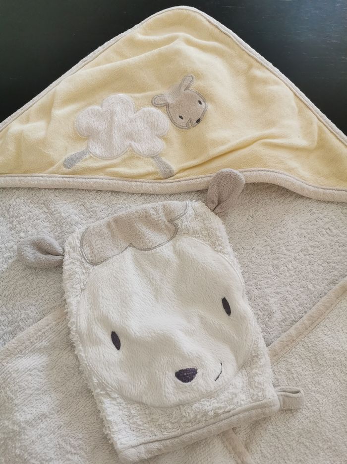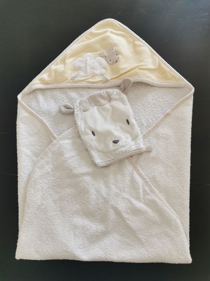 Cape de bain et gant assorti de couleur blanche avec motif mouton sur la capuche et sur le gant. De marque Kitchoun.