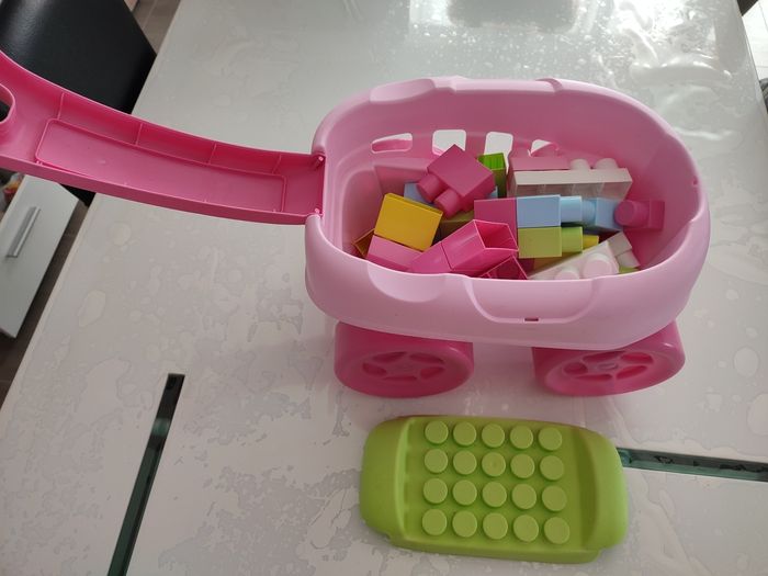Descriptif technique Chariot coloré à tirer comprenant des maxi abrick avec une poignée rabattable et facile à saisir avec une partie servant de socle de construction permettant une activité manuelle pour le développement de l’enfant.