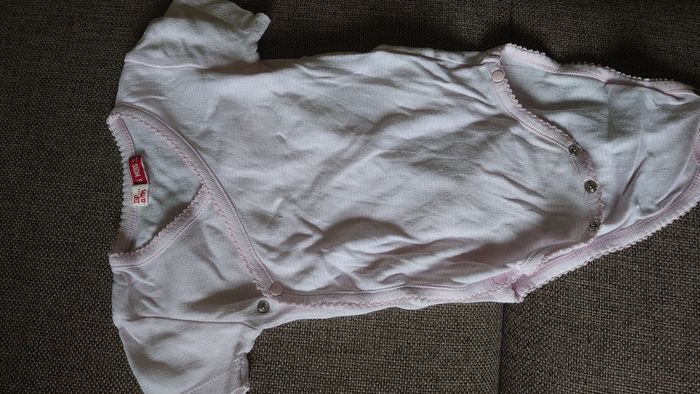 Lot 3 bodies taille 6 mois. 2 Du pareil au même : 1 blanc et 1 rayé rose/blanc. À noter la pression en haut du rayé se détache très facilement. 1 Absorba.