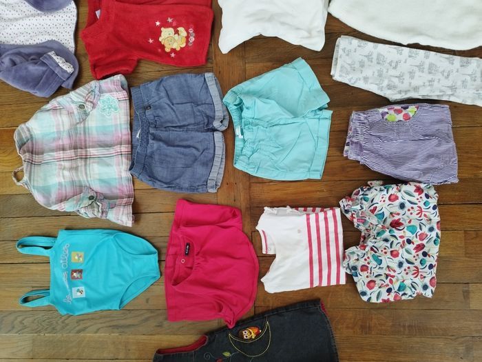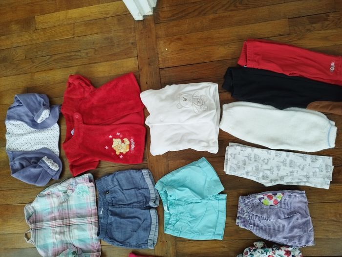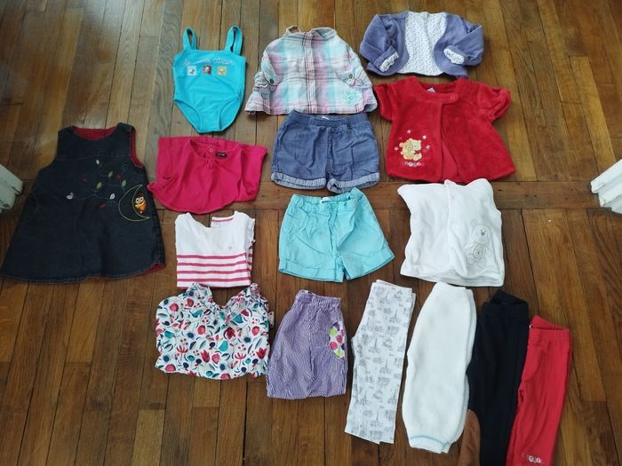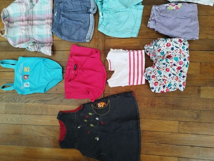 Lot vêtements fille, taille 12 mois 1 robe en jean 1 maillot de bain 4 hauts 2 shorts 1 pantalon 4 leggings 3 gilets Plusieurs marques différentes pour le prix d'une tenuelot