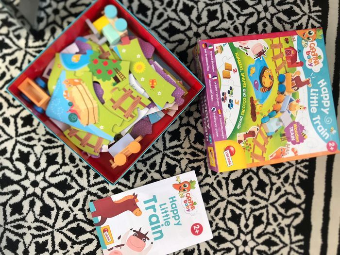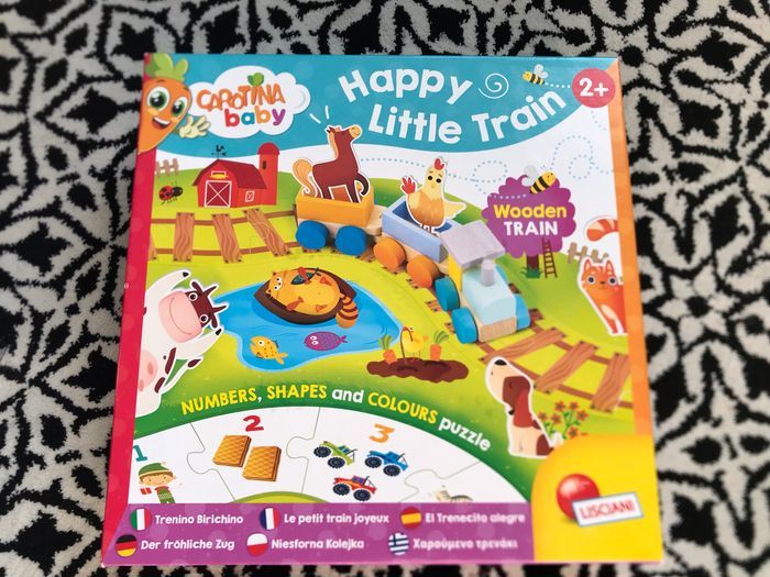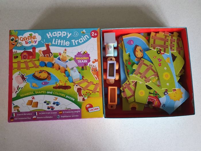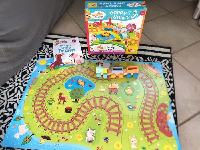 Coffret éducatif constitué d'un petit train en bois et ses wagons et d'un tapis puzzle a recomposer pour devenir un très joli circuit. Produit en très bon état !!