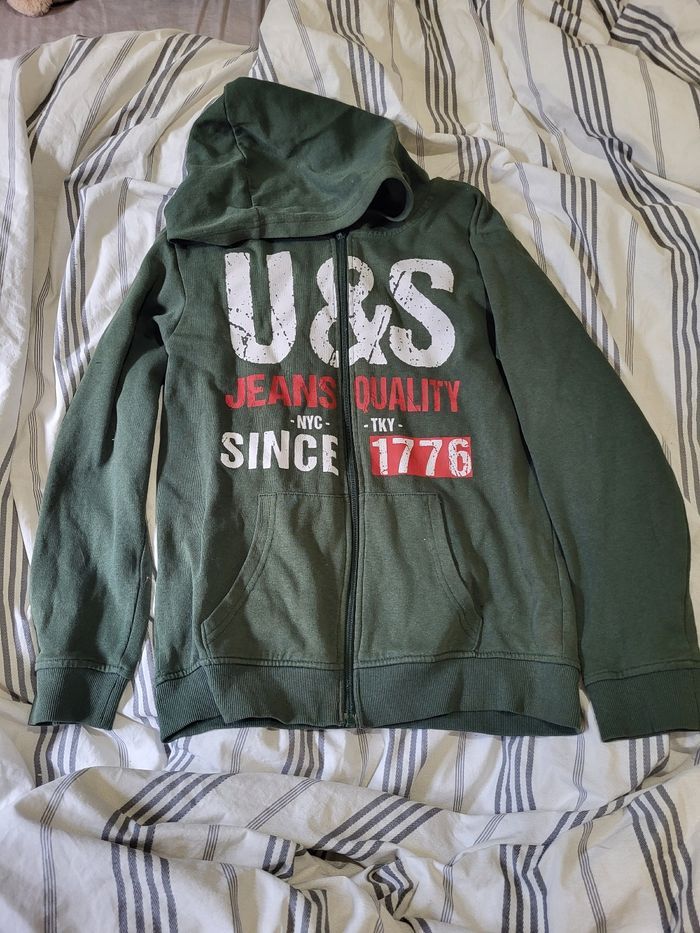 Veste en sweat US Jeans Verte Taille 14 ans Nom de l'enfant sur l'étiquette Peinture qui est un peu partie sur la fermeture éclair Très légèrement pluché
