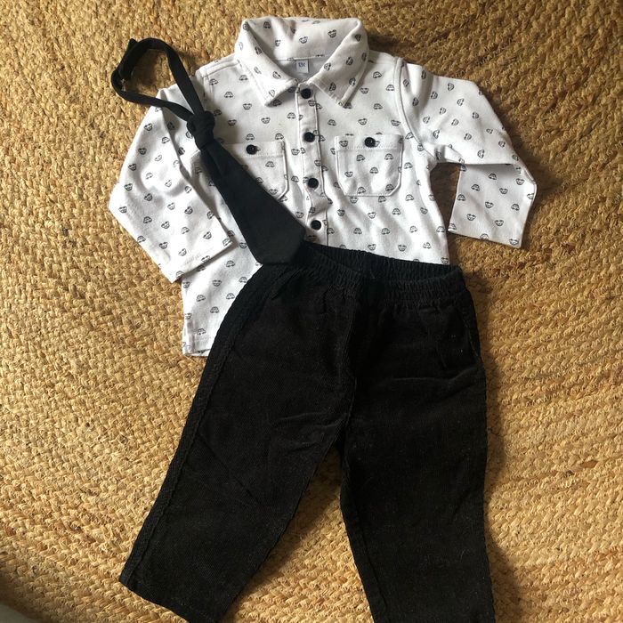 Joli ensemble en parfait état Cravate avec scratch Pantalon velour et teeshirt boutonné avec motifs voitures