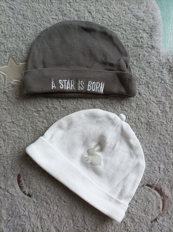 Je vends un lot de deux bonnets pour garçons Les Bonnets peuvent être mis les deux premiers mois de vie environ Couleurs blanc et gris foncé