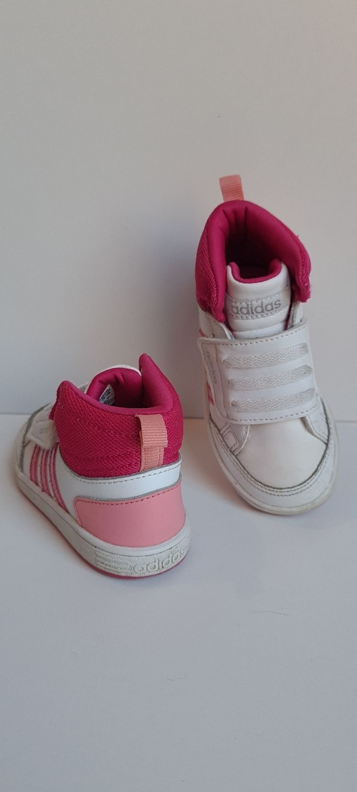 Basket Adidas Hoops, blanc/rose, avec scratch et bandes pailletées. Pointure : FR 23