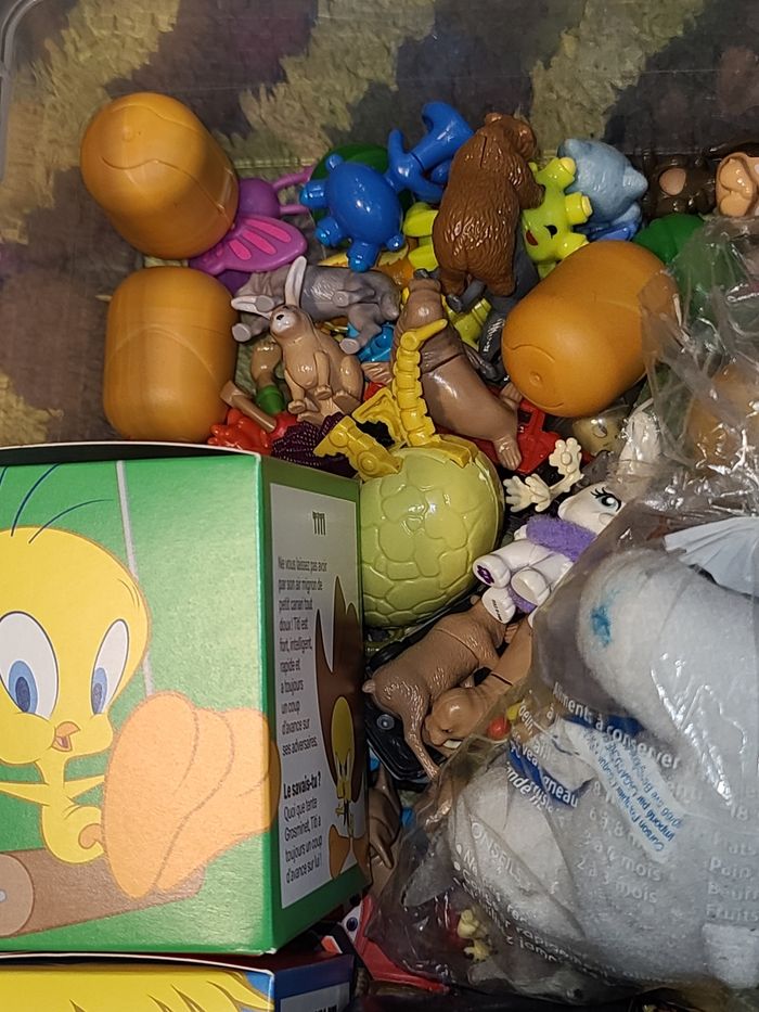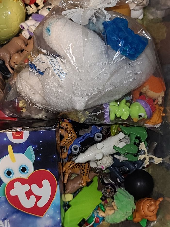 Je vends ce lot pour 5€, il y a de tout dedans, je rajouterai d'autre jouet pour finir de remplir le carton au moment de l'achat !