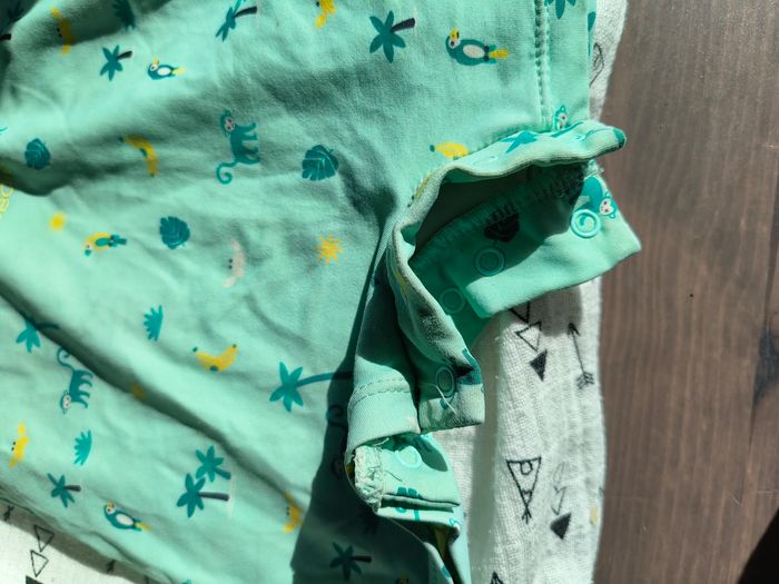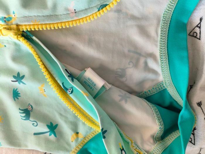 Taille normalement. Peut se porter dans les 2 sens (fermeture a l'avant ou a l'arrière). Pressions à l'entre jambe. Matière maillot. Manches et jambes courtes Porté un état mais en très bon état.