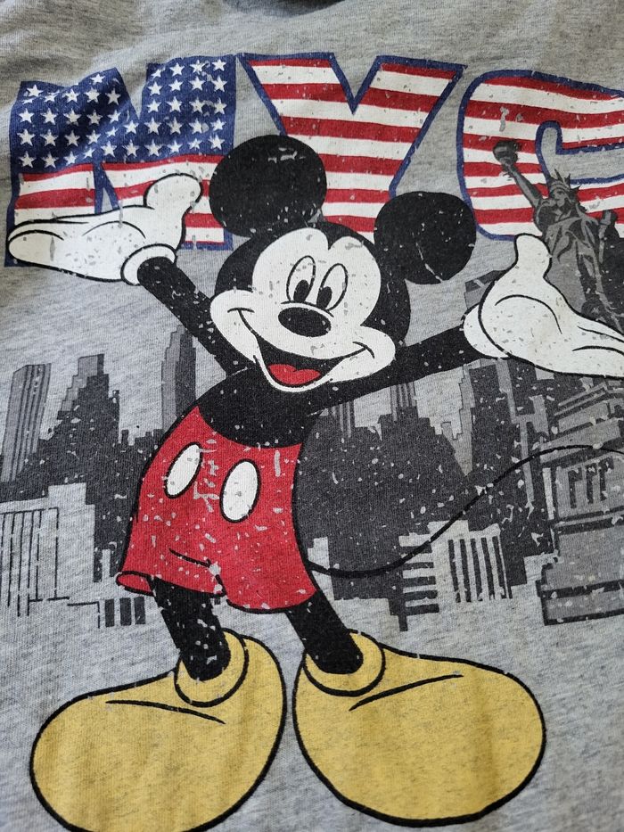 Tee-shirt gris Disney manches longues Mickey NYC 6 ans Mis 2 fois Attention dans le dessin plein de petit trou ds la peinture (cf photo) c'est normal, c'est fait exprès
