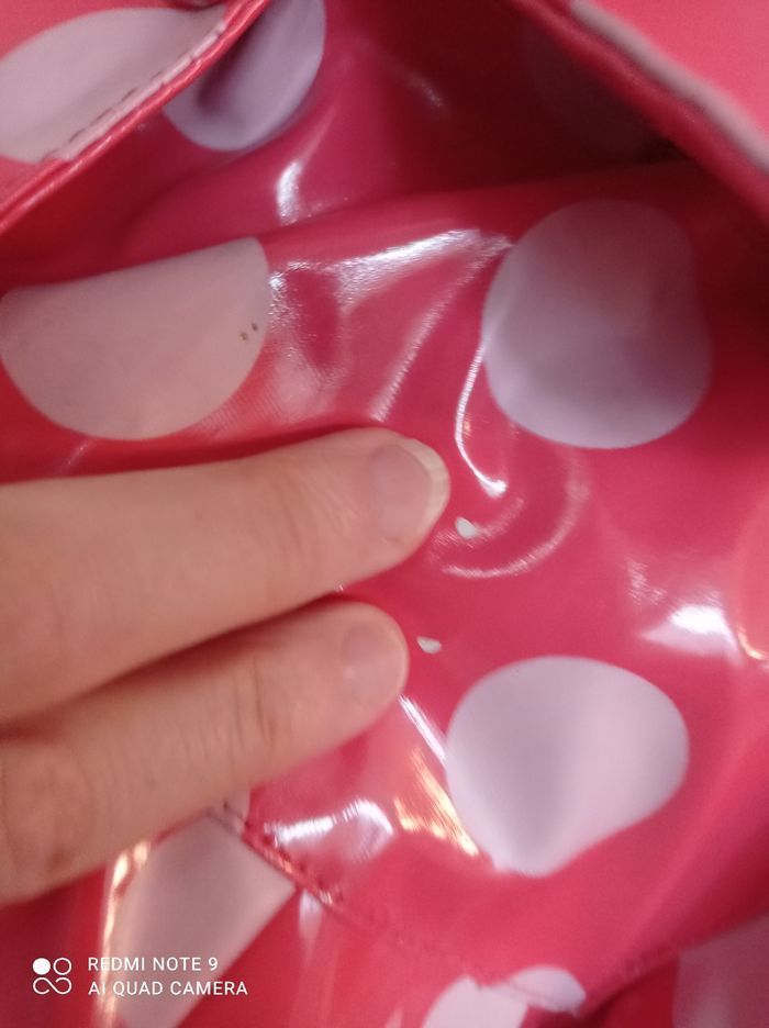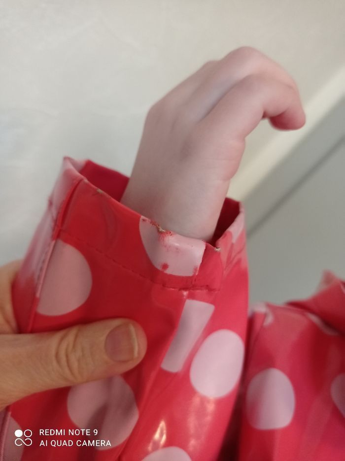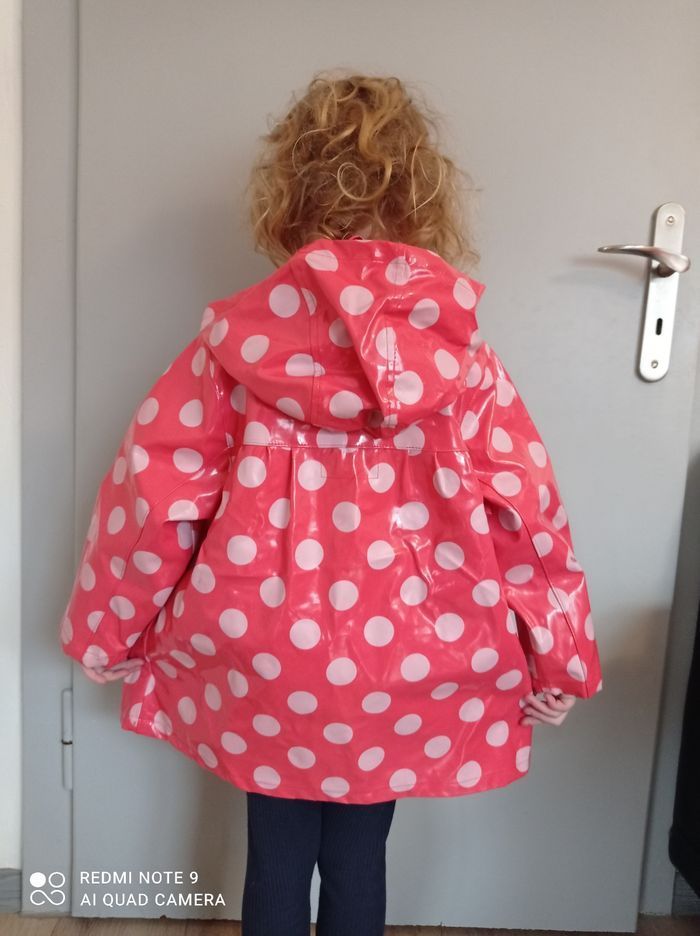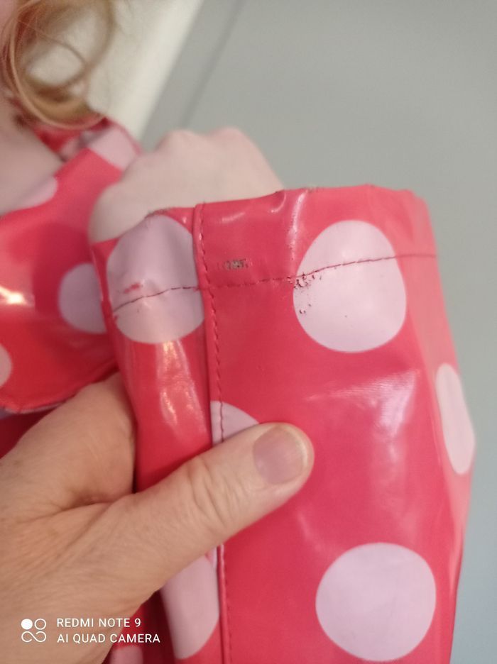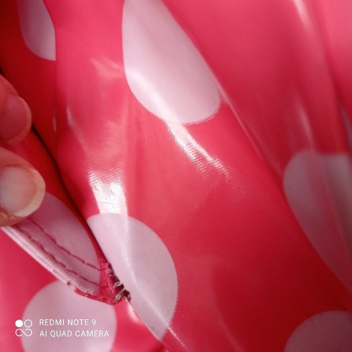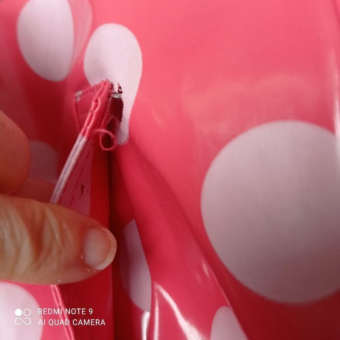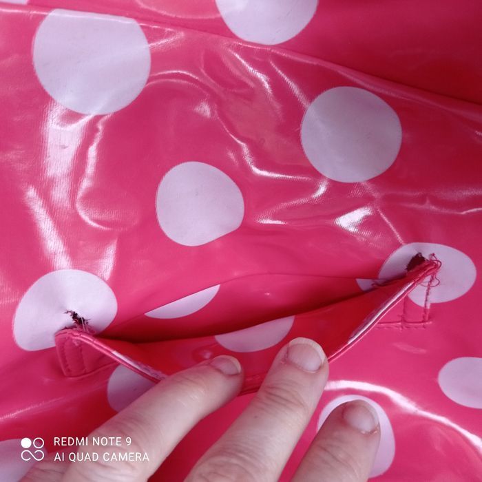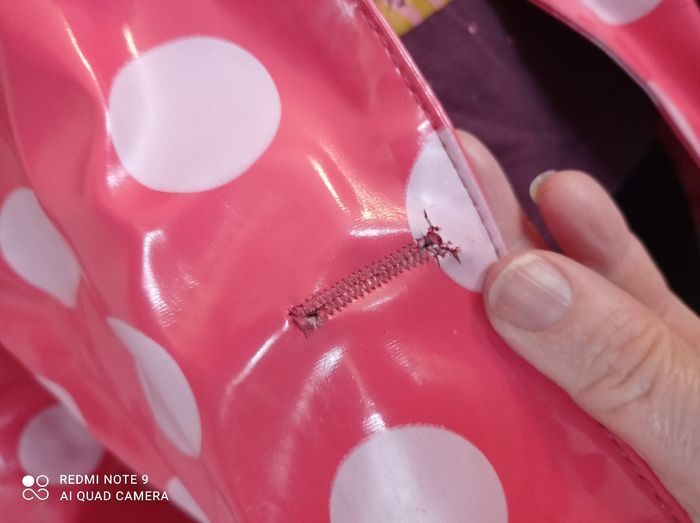100% polyester enduit. L épaisseur fait qu il y a des trous aux côtés des poches. Défauts voir photos.