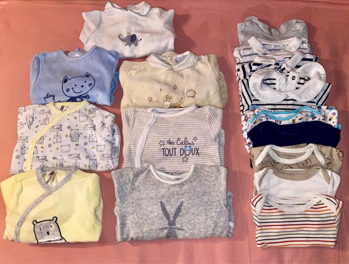 Lot bébé 3 mois blanc bleu jaune gris blanc 7 pyjamas dont 2 à col et 2 neufs 9 bodys dont 4 à col Marques variées Couleurs mixte hiver Marques variées : boutchou, petit bateau, kitchoun, orchestra