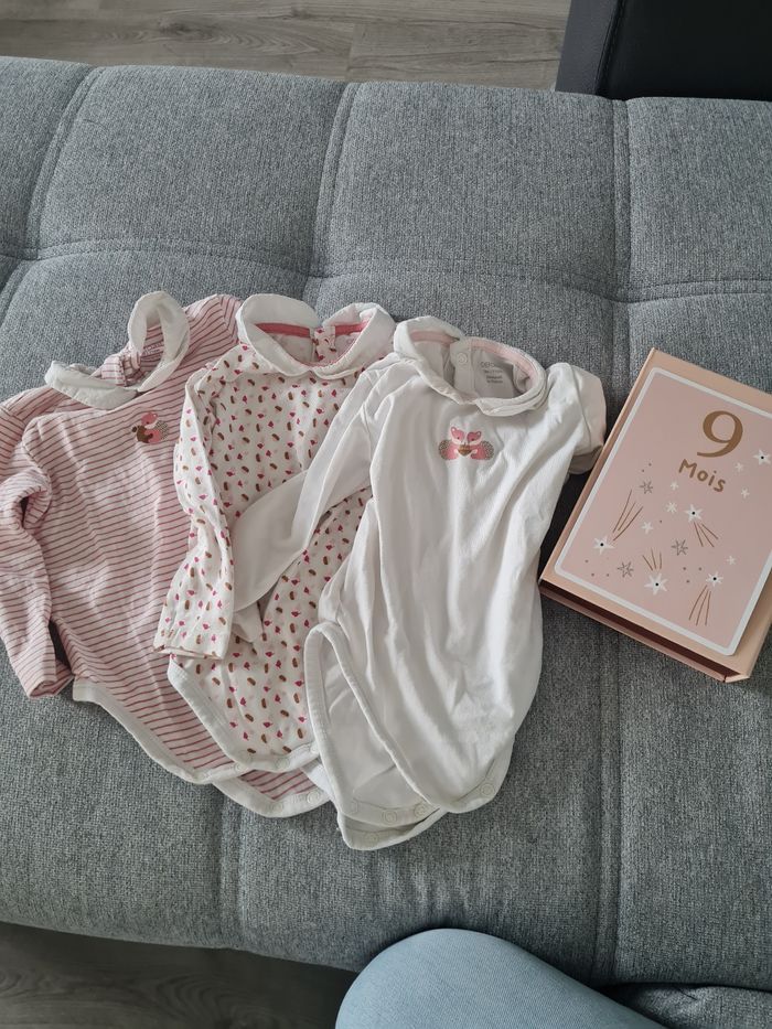 Lot de 3 bodies Quelques petites tâches au niveau du col et manche du bodie blanc Très bon état Taille 9 mois