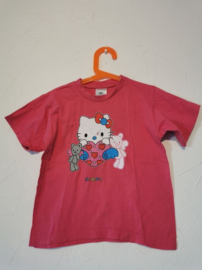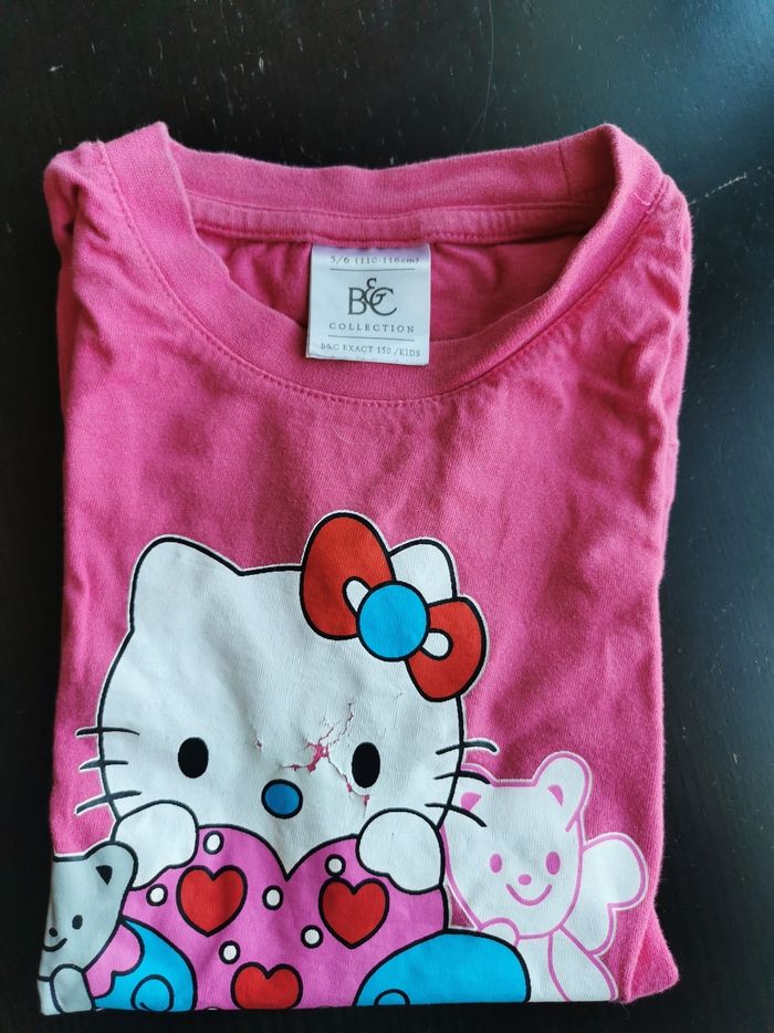 T shirt rose taille 5 ans, avec Hello Kitty. Figure principale de Hello Kitty légèrement craquelée comme visible sur la dernière photo