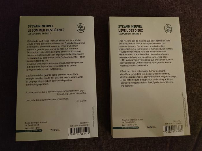 📖 Lot de 2 livres de poche 📖 Le 1er "Le sommeil des géants, les dossiers thémis partie 1" et le 2eme "L'éveil des dieux, les dossiers thémis partie 2" 📖 Auteur "Sylvain Neuvel" 📖 État nickel proche du neuf (sorti d'imprimerie, il a juste déménagé avec nous 😅) 📖 Prix de vente des 2 livres en librairie 14,70€