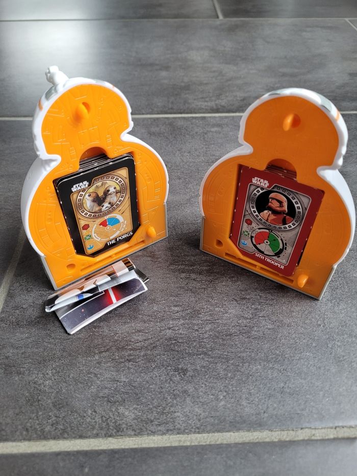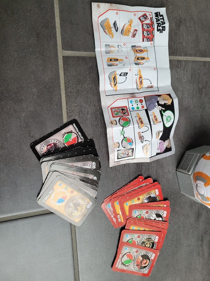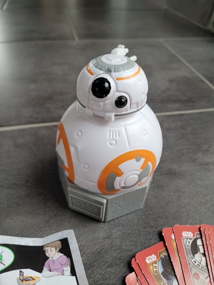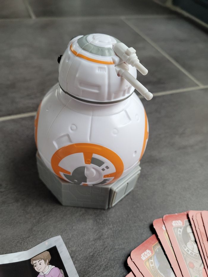 Figurine bb8 de star wars avec jeu de cartes à l intérieur. Il n a pas servi, juste posé sur une étagère en décoration La figurine comprend le jeu de cartes ainsi que la notice