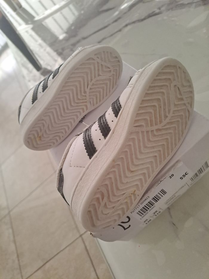 Basket superstar bébé Taille 20 Elles sont pas neuve voir photos mais en bon état. Elles sont était laver. Acheter 55euros. A vendre 10euros.