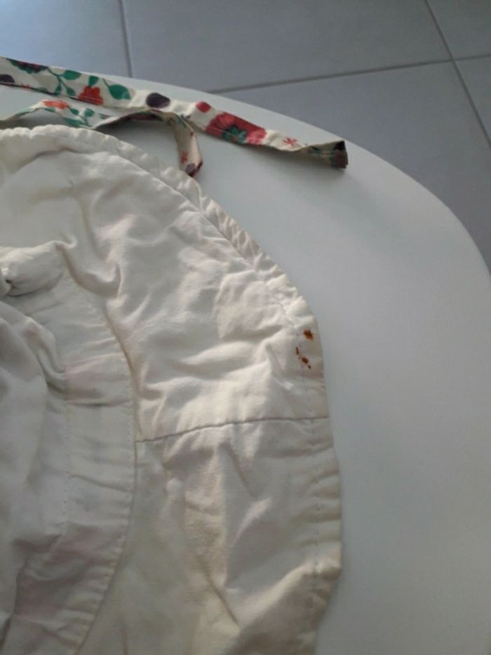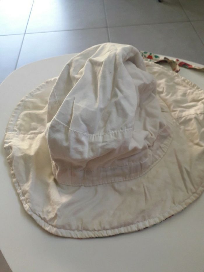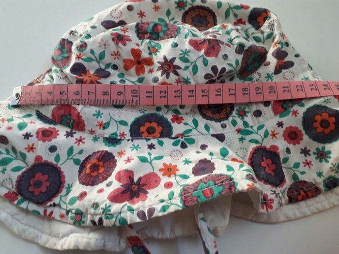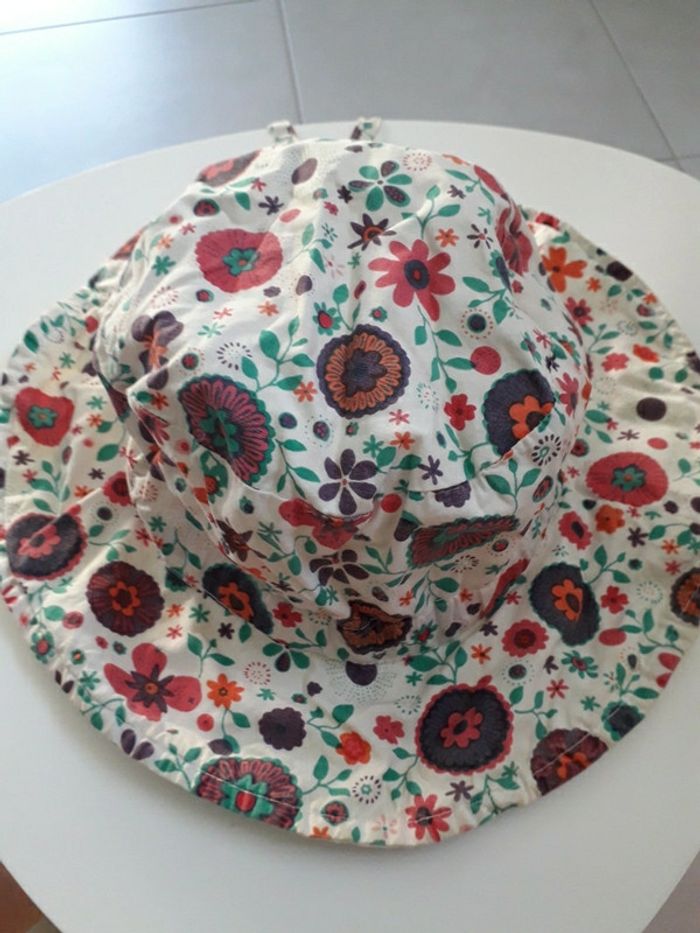 chapeau réversible: un côté fleuri, un côté blanc il n'y a pas d'étiquette ni de marque, ni de taille porté, en bon état ( sauf une tâche du côté blanc) taille mesurée à plat : environ 24 cm, pour fillette de 4 à 6 ans