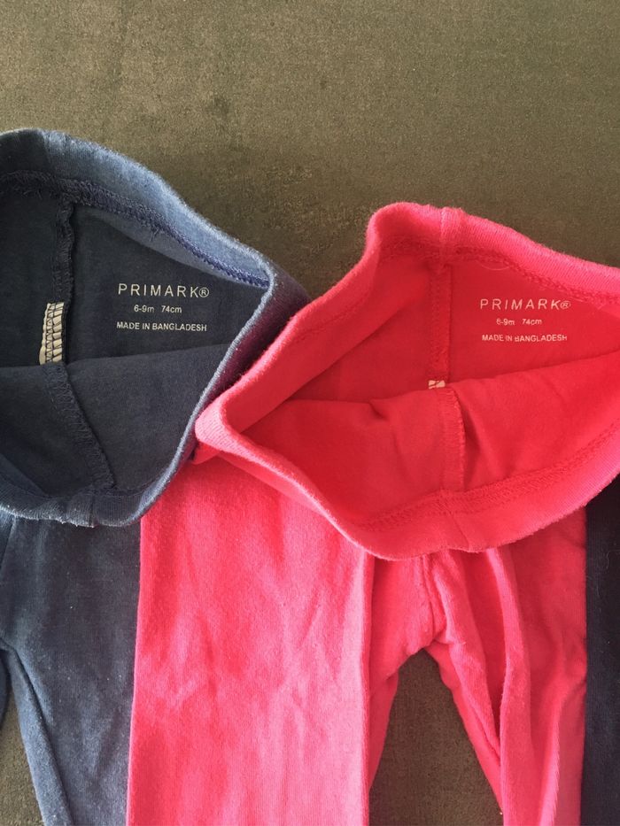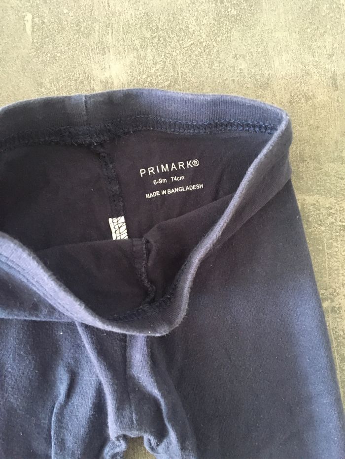 Lot de 3 leggings taille 6-9 mois. Primark taille grand plutôt du 9 mois. Le gris bleu a des traces d usures au niveau des genoux. Voir photo. Bon état pour les deux autres.