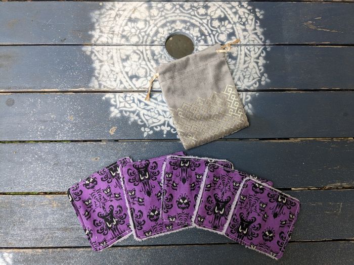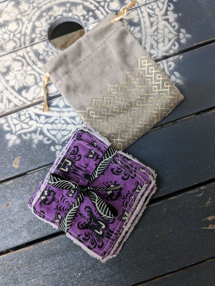 Lot de 5 carrés cotons éponge bambou ultra doux + pochon. Tissus imprimé thème Hanted Mansion Disney