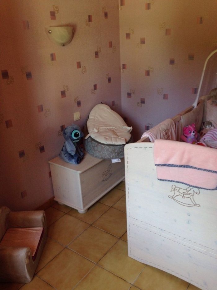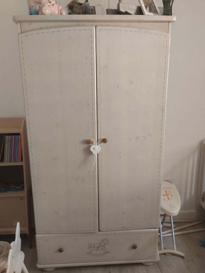 1 coffre a jouet Une garde robe Un lit évolutif, 3 niveau et 4 barreaux du lit peuvent s'enlever pour que bébé puisse monter et descendre du lit. Une table a langer qui évolue en commode