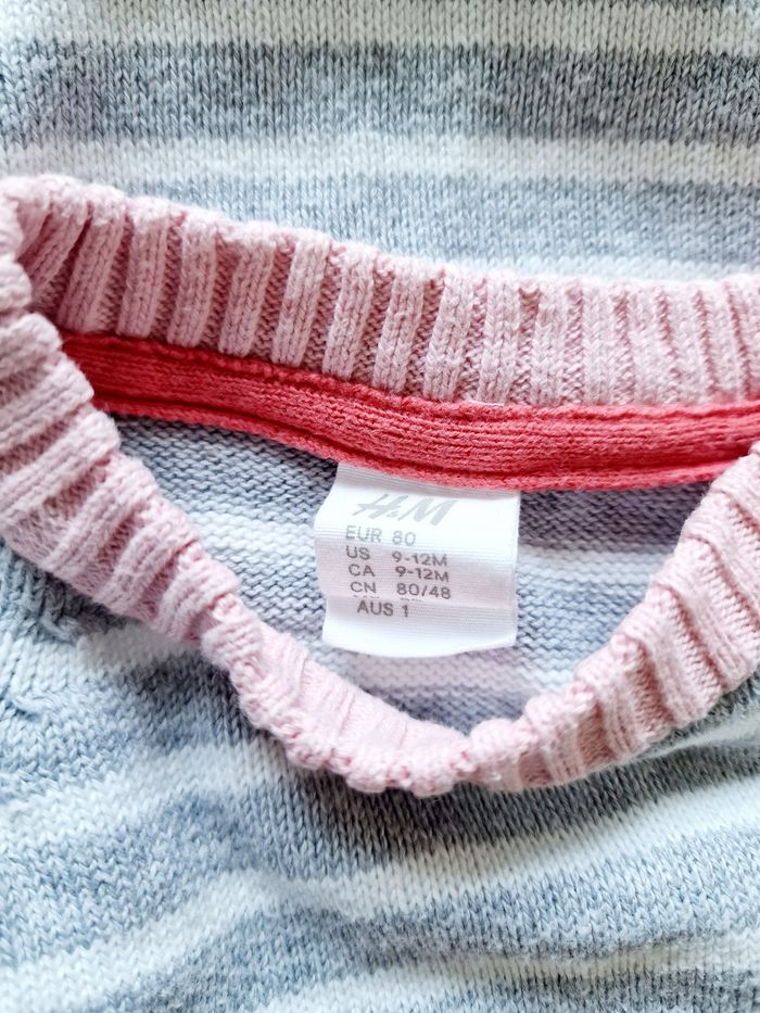 Tous mes articles H&M : #hmsev Tous mes pulls : #pullsev Tous mes habits ♀️ 9 mois : #9moissevfille Tous mes habits ♀️ 12 mois : #12moissevfille 🚨 Prix fixe Pull en maille fine à manches longues et col rond Marque : H&M Couleurs : gris, blanc et rose Taille : 9/12 mois - 80 cm État : très bon état 100% coton Retrait sur place ou envoi.