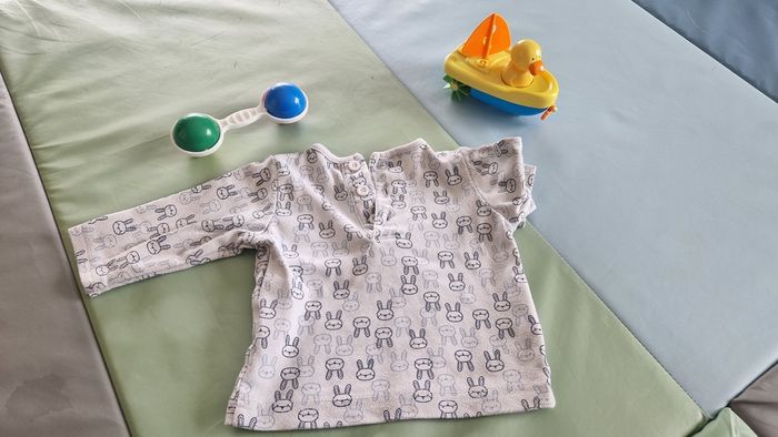 Bonjour Je vends ce tee shirt manches longues Mixte Motifs de petites têtes de lapins Bon état- bouloche légèrement Plus d étiquette, mais 3 mois Bonne journée, et bon shopping Julie
