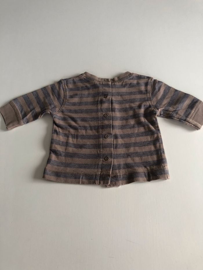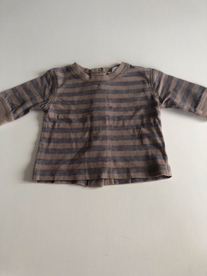 T-shirt rayé marron/gris (68% coton + 32% polyester) Ouverture par bouton pression. Taille 1 mois.