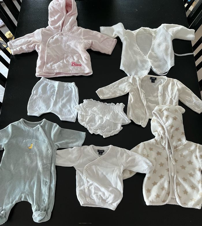 2 vestes 0/1 mois 3 brassières 0/1 mois 1 culotte 1 mois 1 short naissance 1 pyjama naissance