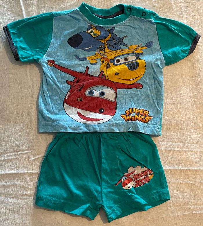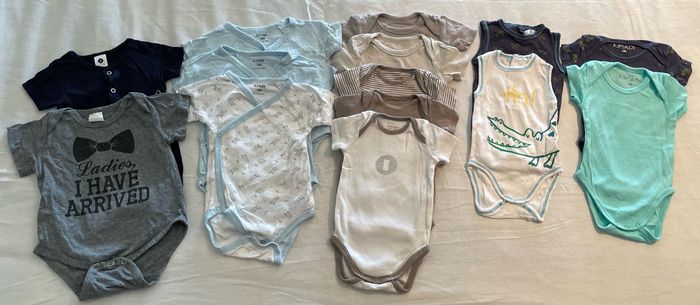 Un lot de 3 mois garçon ( okaidi, kiabi….) avec 40 pièces - 12 bodys manches courtes ( okaidi, kiabi…) - 2 bodys sans manche -2 tee-shirts manches longues -1 short en jean -1 ensemble super wings -8 tee shirts - 1 pyjama long + pantalon avec pieds -8 pyjamas fins - 4 body manches longues
