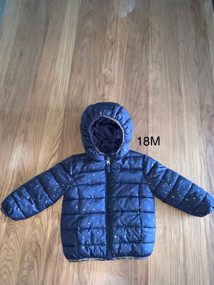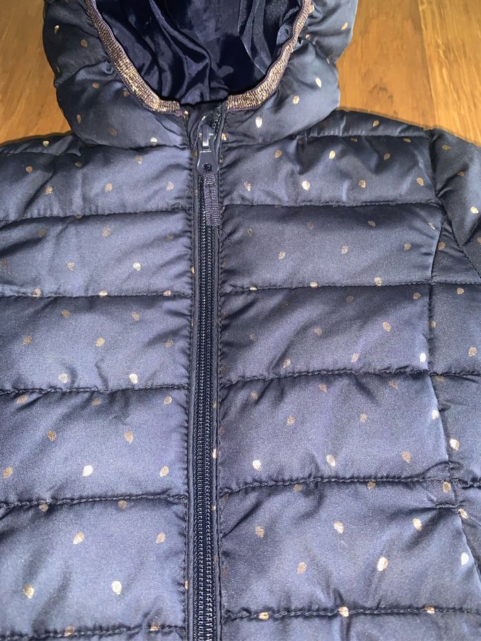 Doudoune bleue marine avec motifs dorés, légèrement effacés sur le devant (photo)