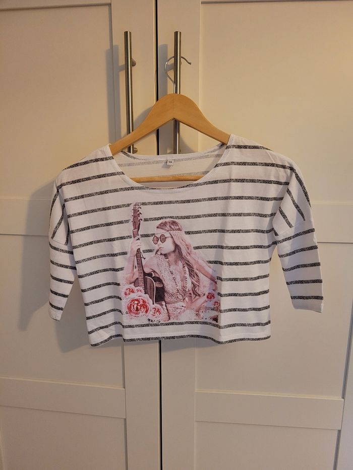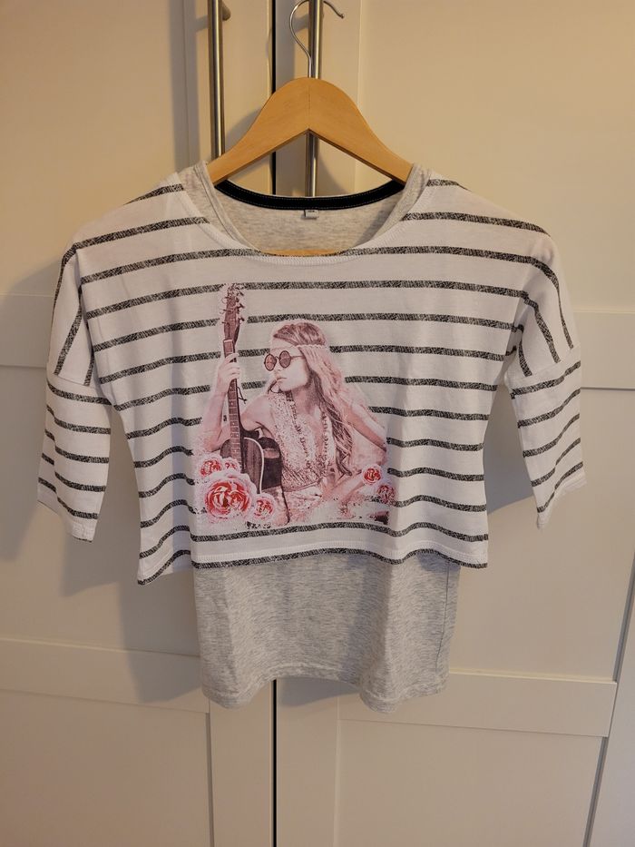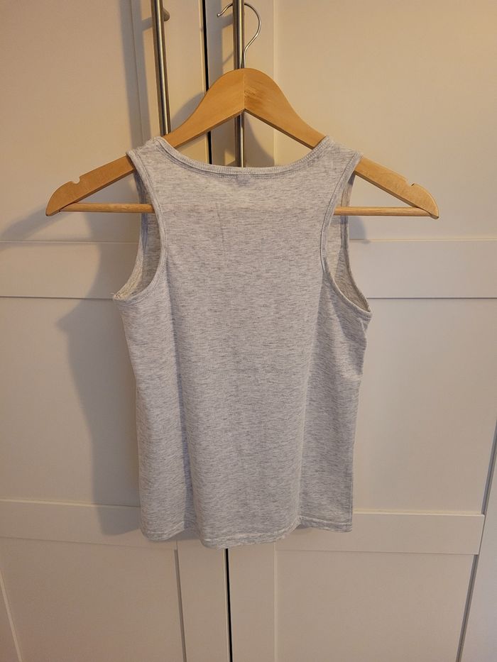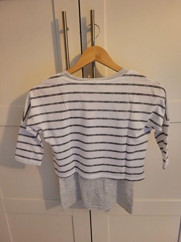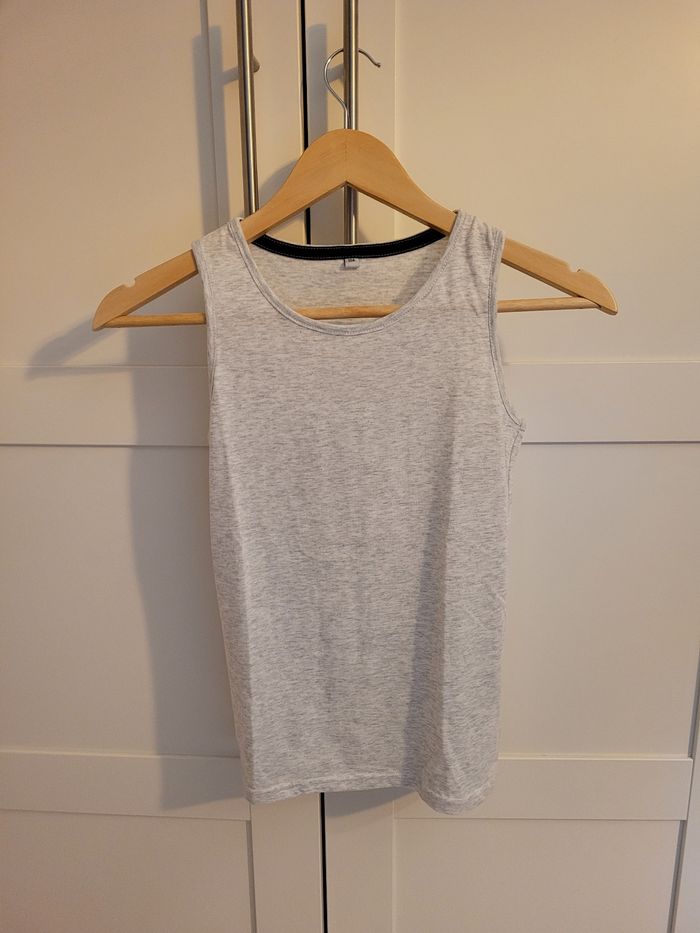 Ensemble taille 10 ans composé de : - 1 crop top, manches 3/4, marinière imprimé, - son débardeur gris clair, NEUF sans étiquette (jamais porté).