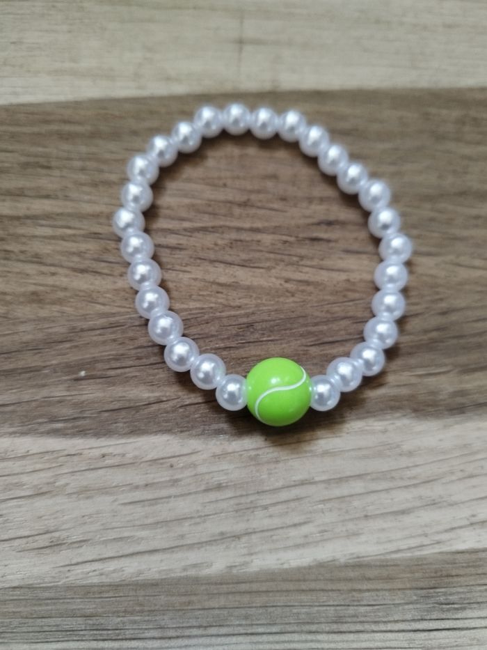 Bracelet en perles blanches et balle de tennis. Mesure 14cm. La couleur des perles peut être modifiée ainsi que la taille du bracelet. Jamais porté.