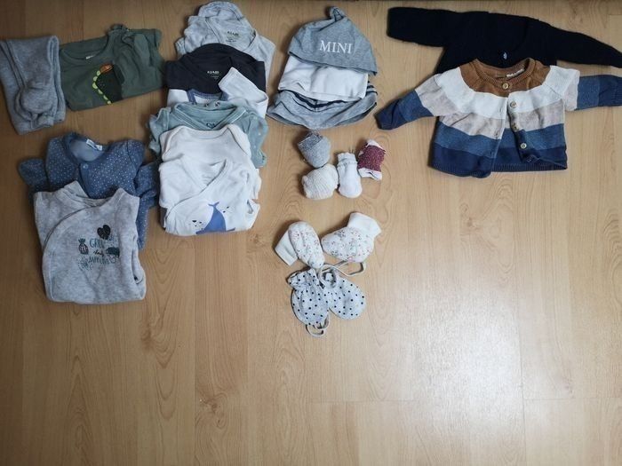 Lot vêtements naissance: 21 pieces 6 bodies manche longue 2 pyjamas hiver 1 t-shirt manche longue 1 pantalon 1 paire de chaussons 1 paire de moufles 3 bonnets 4 paires de chaussettes 2 gilets manche longue