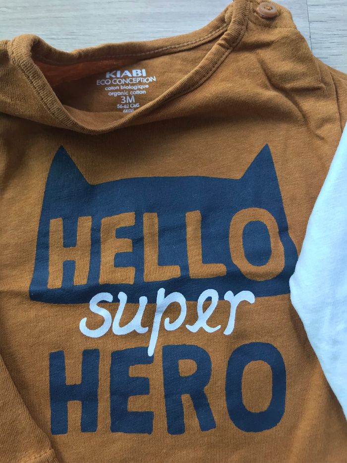 Lot de 3 tee shirts manches longues 3m Un bleu marine Kiabi « toujours premier dans le cœur de maman » Un marron Kiabi « hello super héro » Un blanc tape à l’œil « hello petit charmeur »