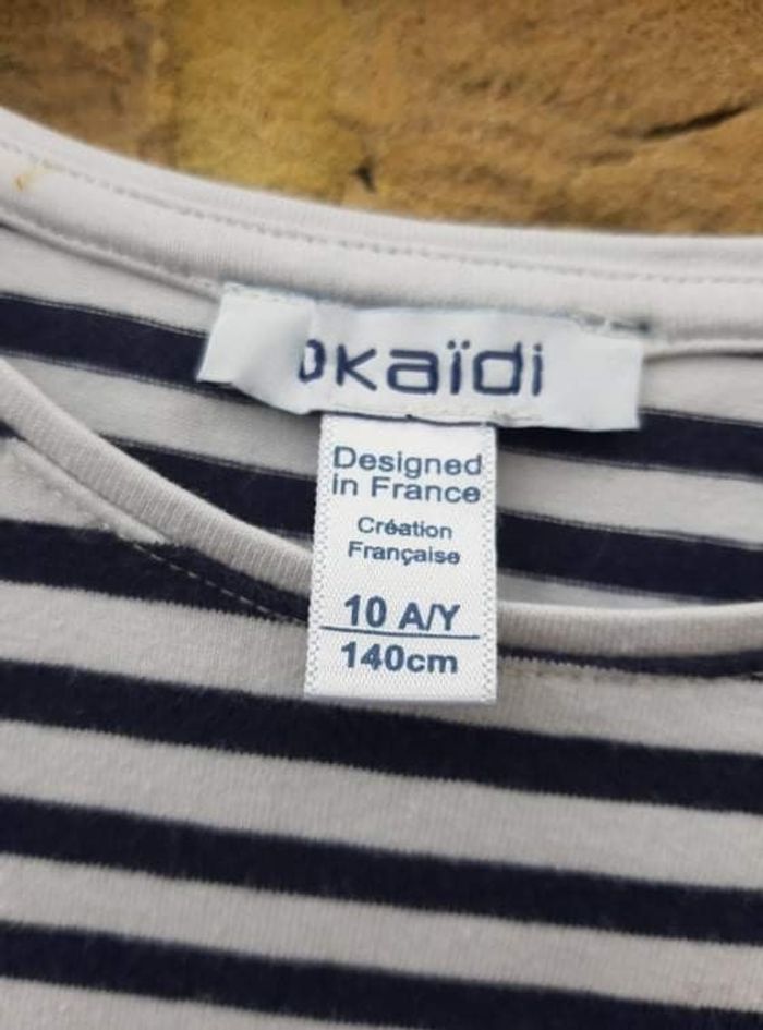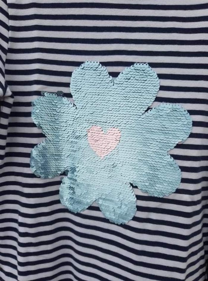 T shirt longues manches ligné marine et blanc avec une fleur bleue en sequin