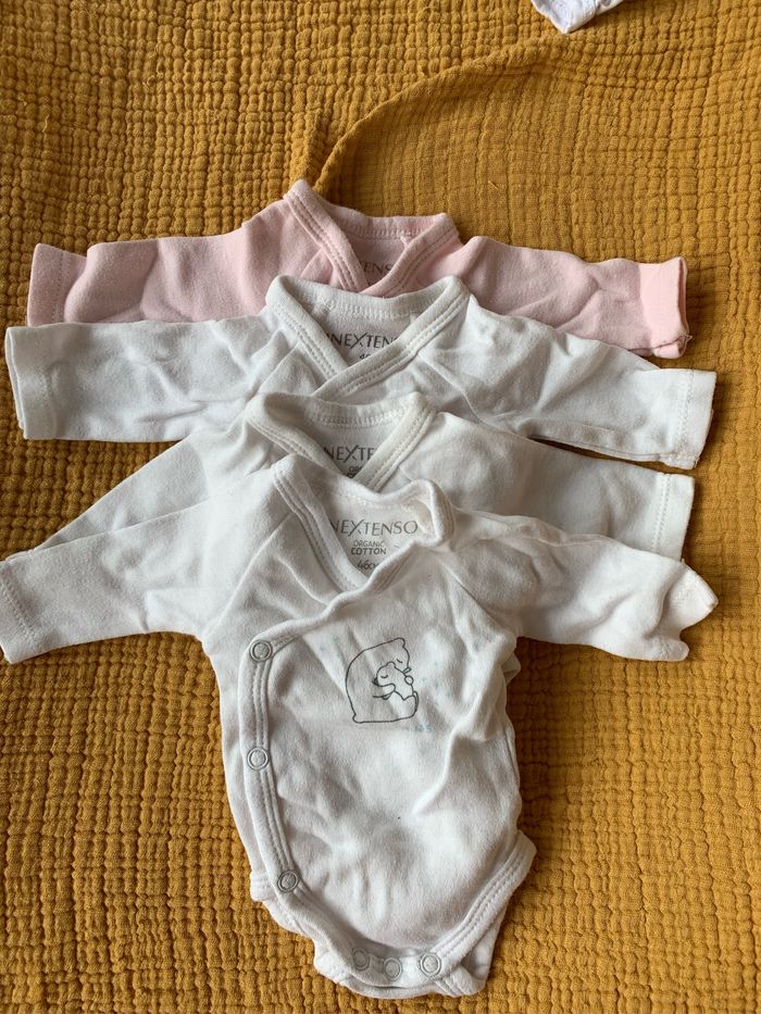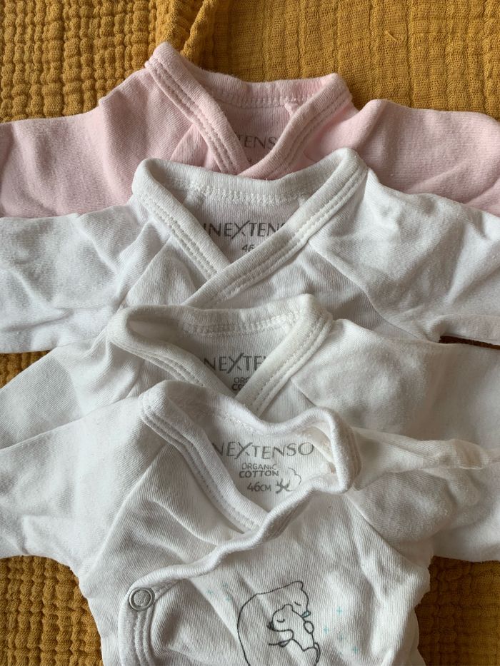 4 bodies pour bébé prématuré ou très petit gabarit de la marque Inextenso. 46 cm (à peu près taille 0). Mixte pour les blanc + 1 rose
