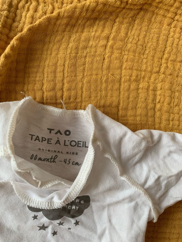 Tapa à l’œil, 2 bodies pour bébé prématuré, taille 00 ( jusqu’à 45cm). Un des bodies a déteint au lavage ( rosé)
