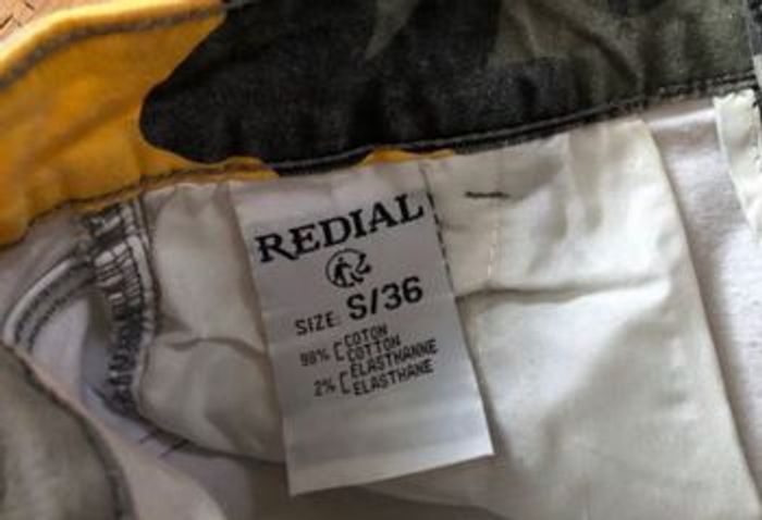 Pantalon baggy Poches cargo sur les côtés Élastique en bas des jambes en coton bien strech Tissus imprimé camouflage kaki ocre jaune moutarde gris et noir 98% coton 2% élasthanne Taille S/36 REDIAL Premium Denim Collection La ceinture mesure à plat sans tirer 35,7 cm, va jusqu’à 40 cm en tirant Hauteur niveau braguette 24,5 cm Longueur entre jambes 68 cm Largeur bas des jambes sans tirer 11,5 cm, va jusqu’à 17 cm en tirant