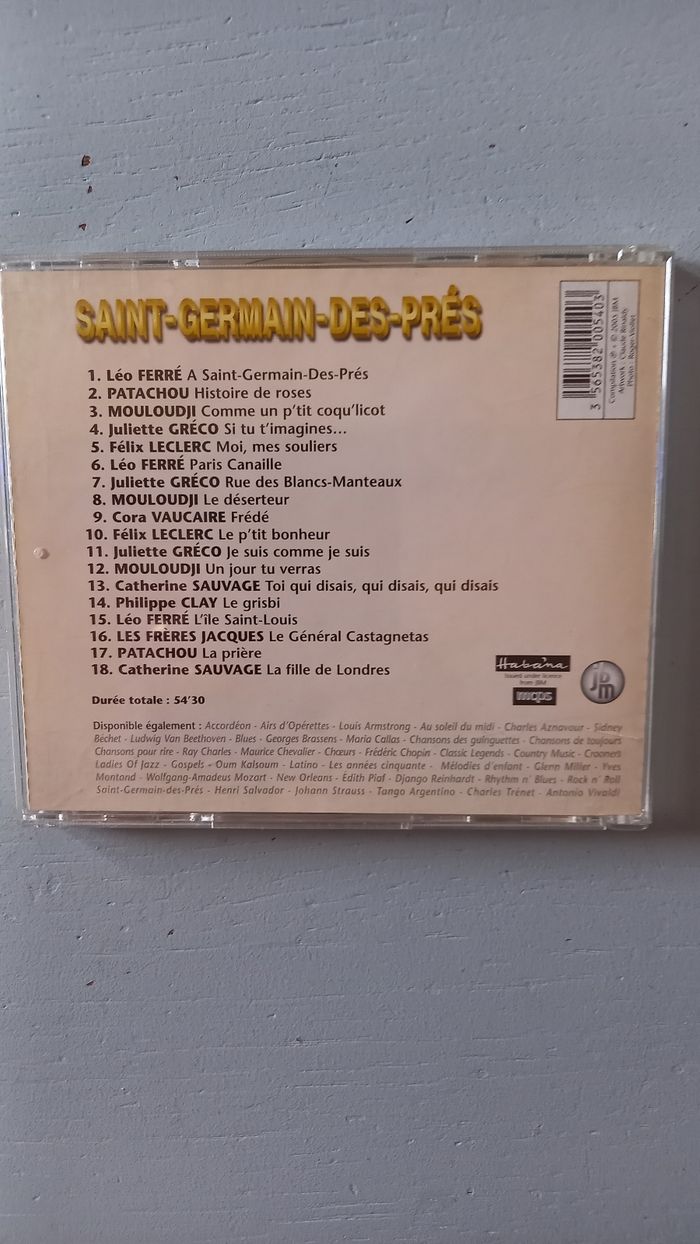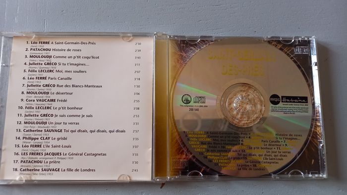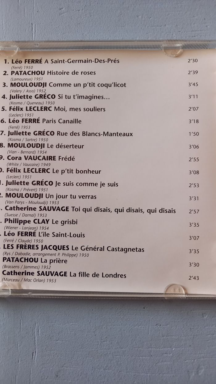 Cd de 18 titres (vérifiés )chansons anciennes Léo Ferré, Juliette Gréco, Félix Leclerc, Patachou,Philippe Clay... Enregistrements originaux. Minimes rayures qui n'impactent aucunement la lecture