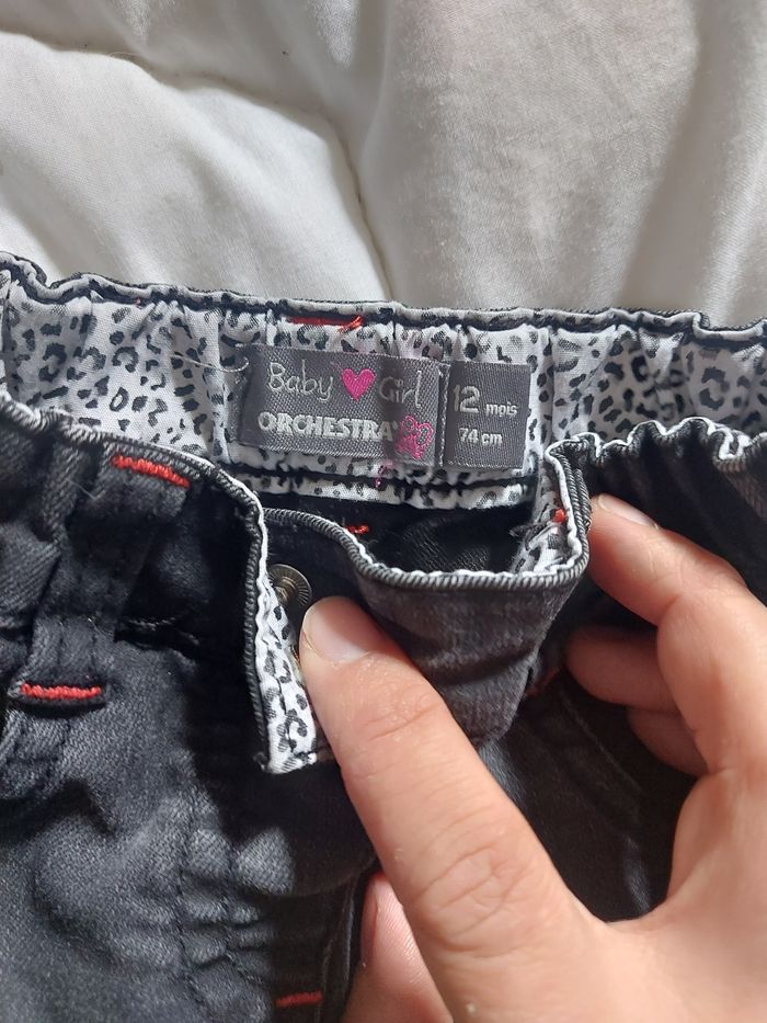 Ensemble composé un tee shirt épais bleu marine avec des petits paillettes de marque in extenso 74 cm et d'un pantalon gris foncé avec des tons rouge de marque orchestra 12 mois. Le tout en très bon état