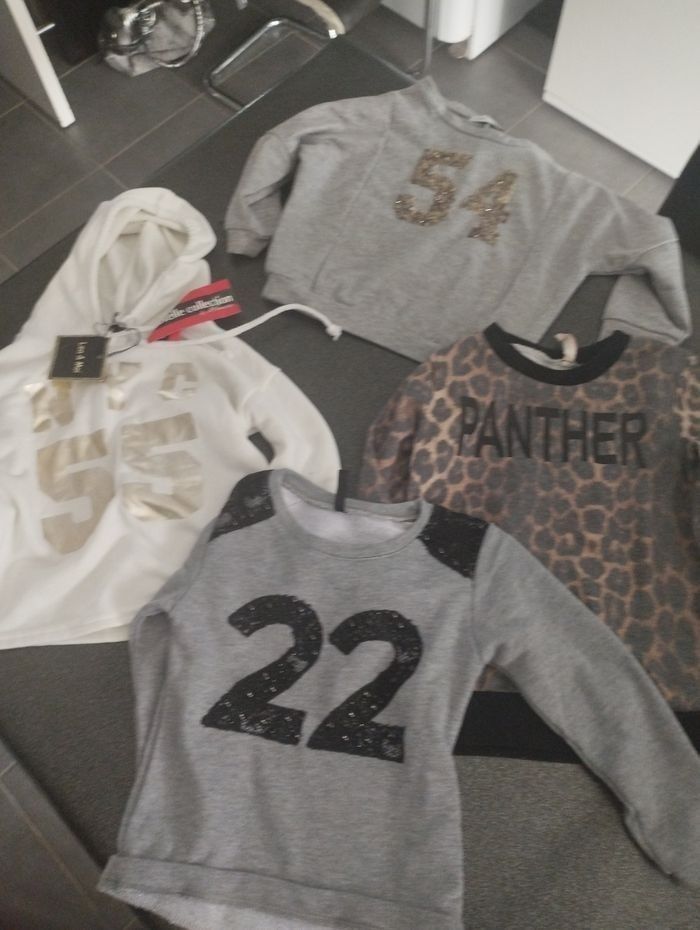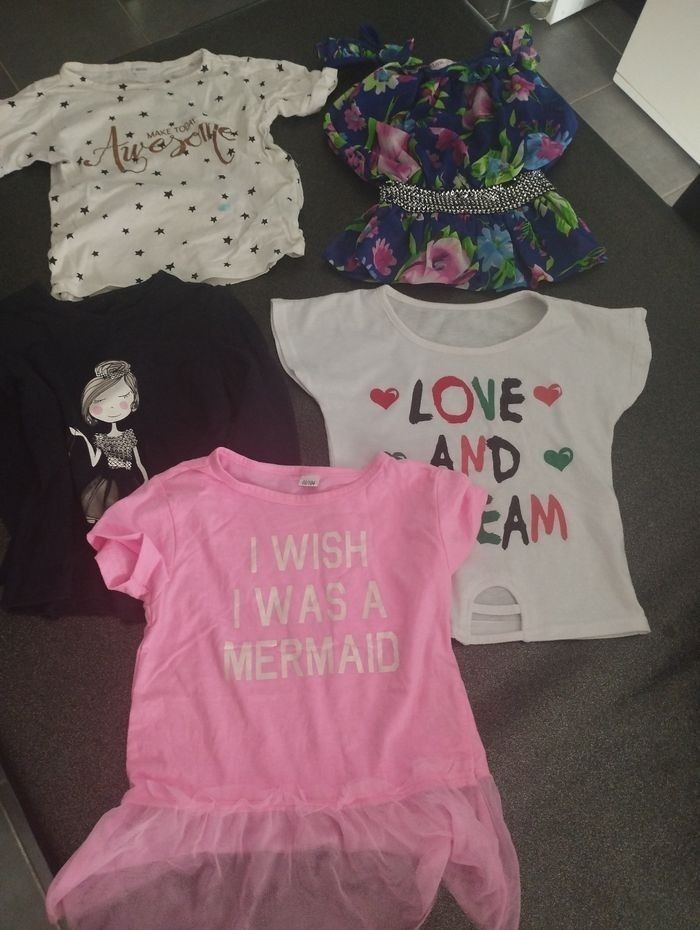 Lots de vêtements filles porté mais en bonne état ⚠️petit trous sur la robe Desigual ⚠️ Petite tache sur 1 tee-shirt ⚠️Le pull léopard bouloché Au total 23 article Différentes marques Desigual Sergent major Kiabi etc...