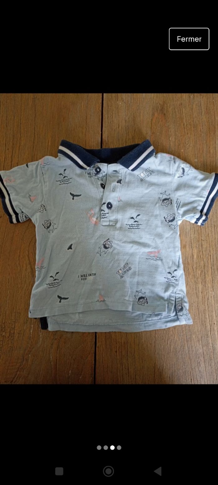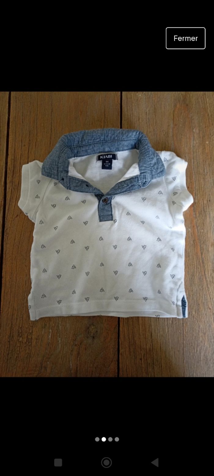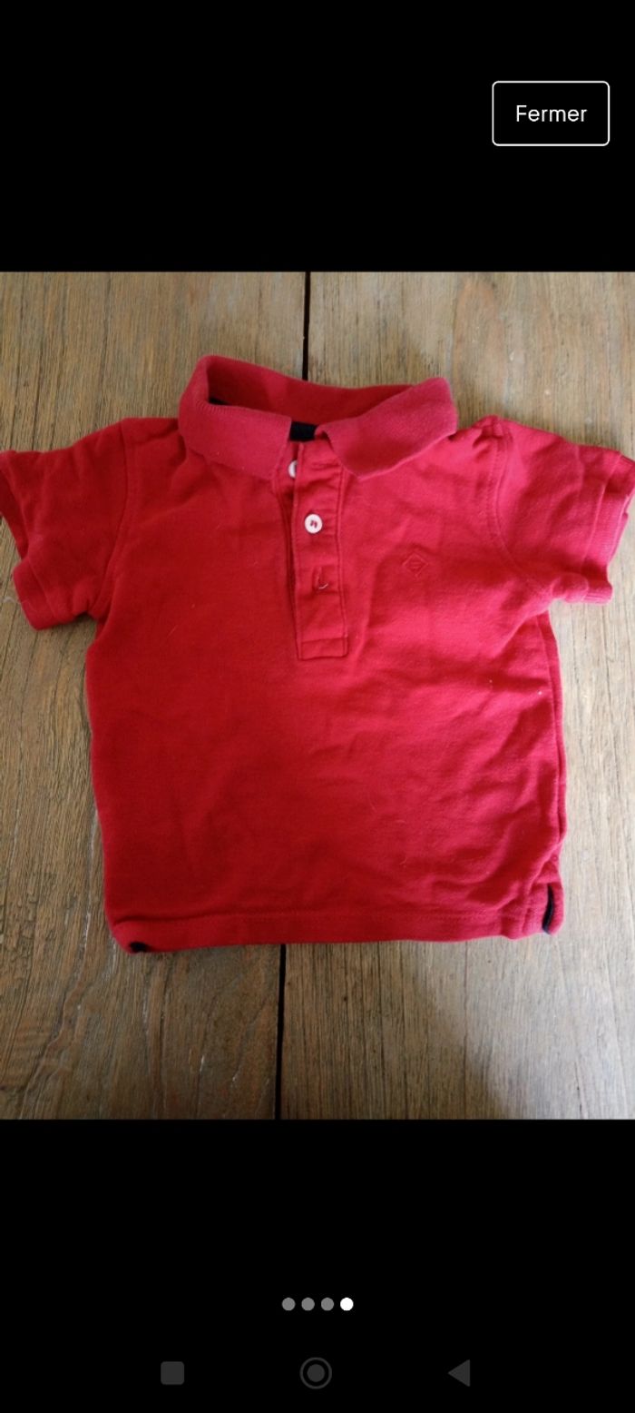 Un polo blanc petit motif bleu, marque Kiabi taille 1 mois. Un polo rouge, marque Primark taille 1 mois. Un polo bleu motif mer, marque Primark taille 1 mois