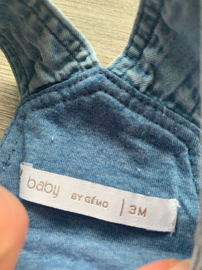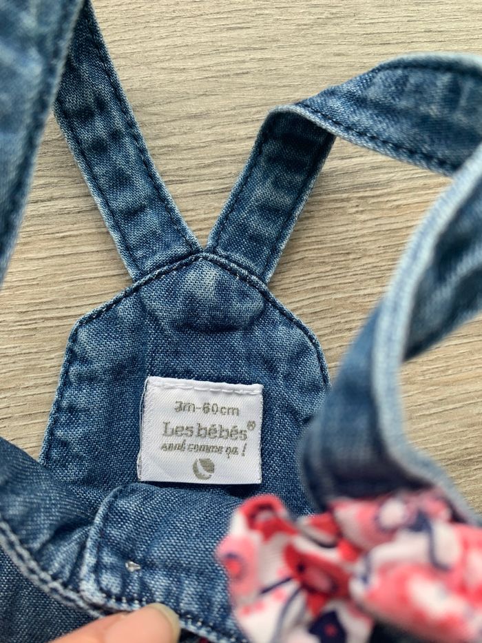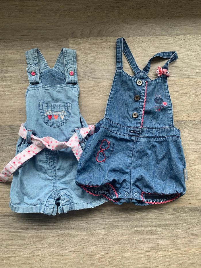 2 salopettes shorts en jeans fille . Taille 3 mois . Parfait état Une à été acheté à Gemo ( celle avec la ceinture) L’autre je ne sais plus