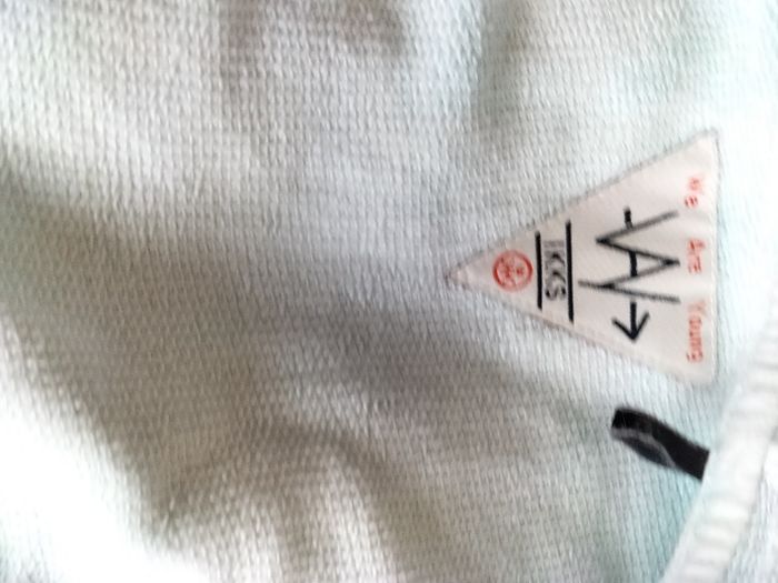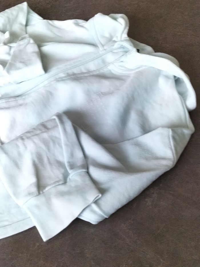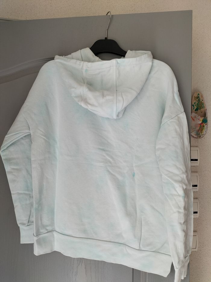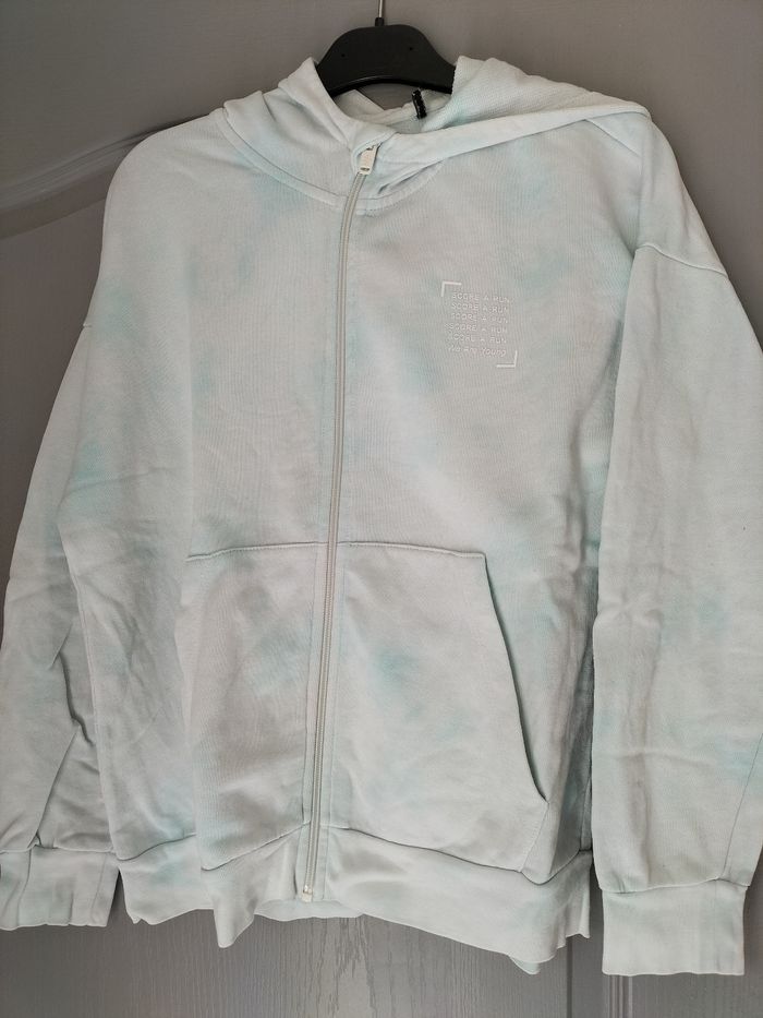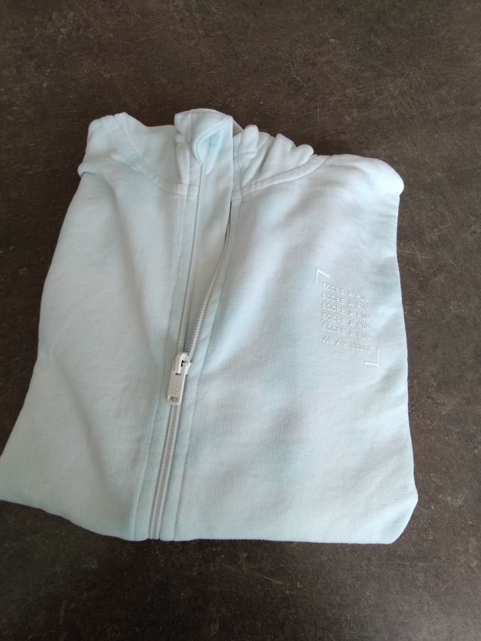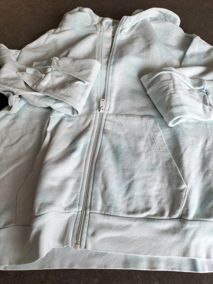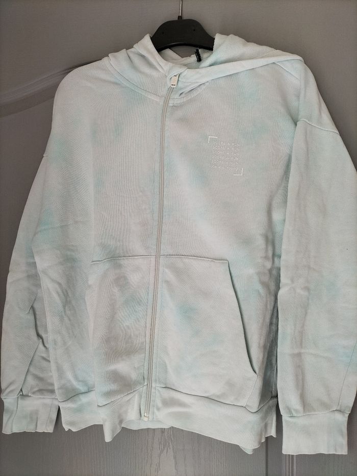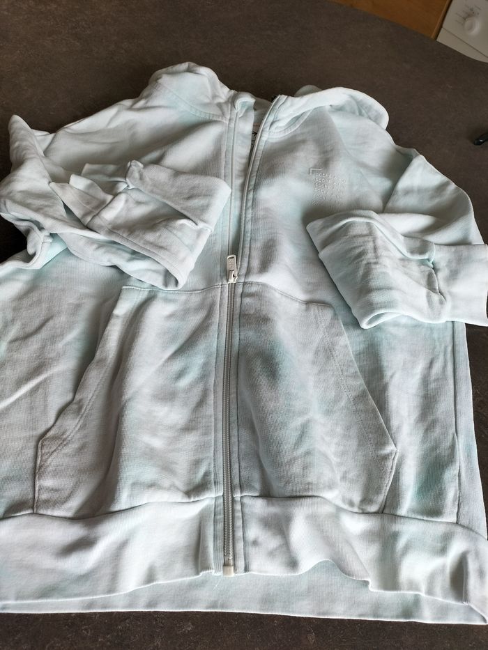 Sweat zippé à capuche bleu et blanc moucheté, en 12 ans en très bon état, aspect délavé. Ikks.
