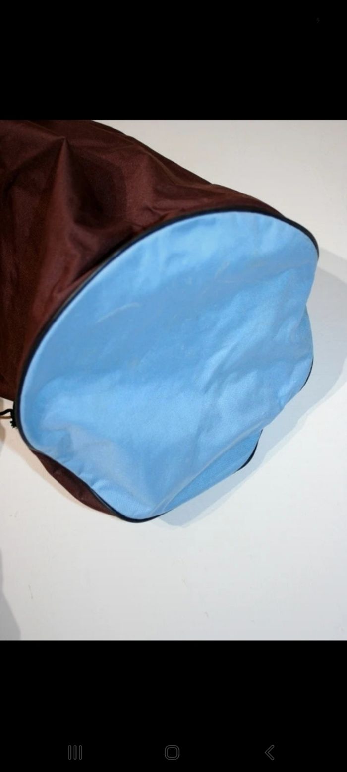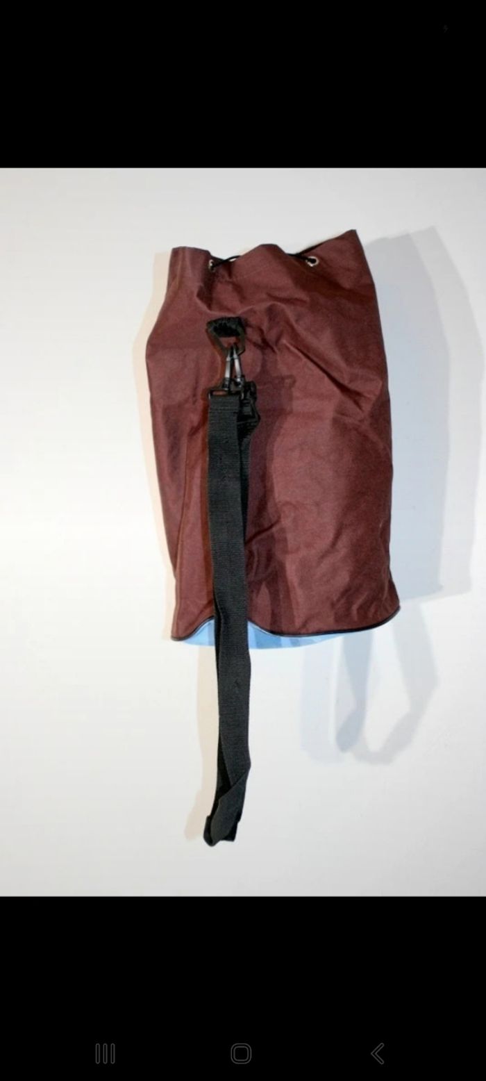 Sac marin ou polochon chocolat et bleu ciel 48cm de hauteur et 30cm de diamètre, bien utilisé, quelques tâches sur le dessous cf photo, poignée sur le côté, 350g