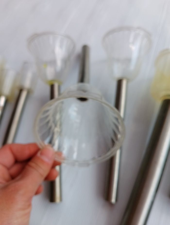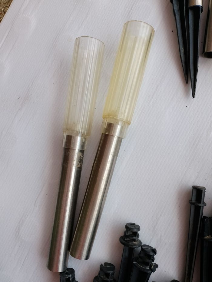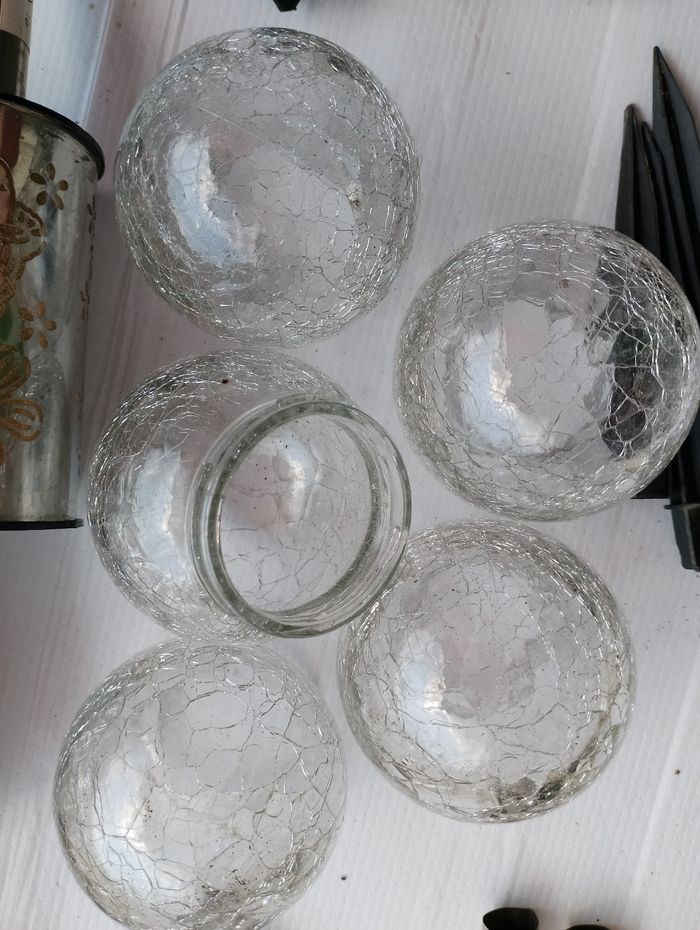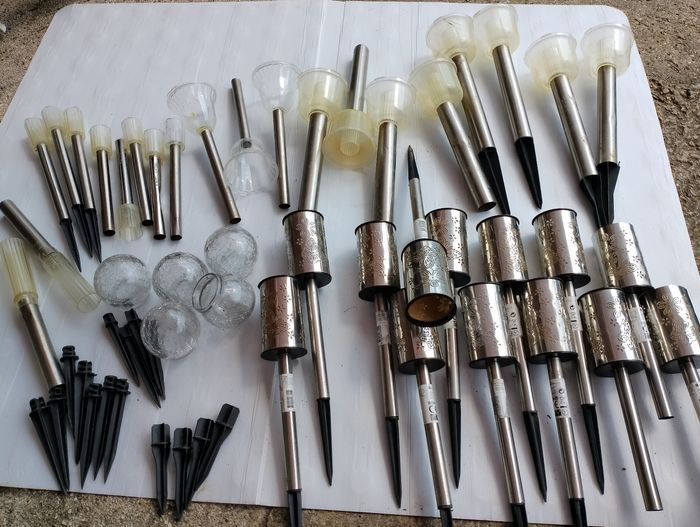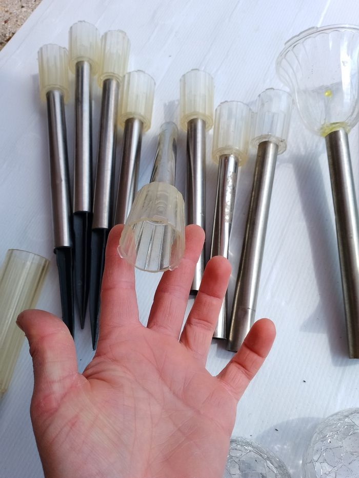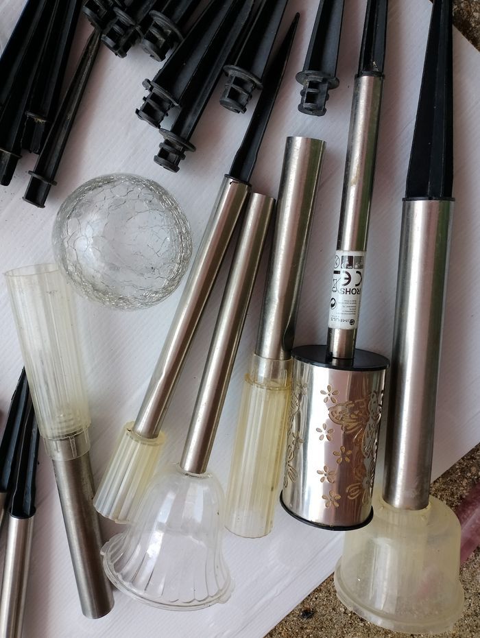 Faire une proposition et me dire ceux que vous souhaiteriez Peuvent servir pour faire de la décoration où pour bricoleur * 13 bornes grise motif fleur et papillon avec tige grise et pointe noir ( manque juste 1 pointe noir sur le pied écrasé et manque 2 rebord noir sur le dessus * 8 bornes avec 8 tube large gris et 6 pointe noir (2 sortent différentes 4 ronde et 2 plates) * 3 bornes en forme de fleur dont 1 fissuré et a été recollé avec tige grises * 8 petites bornes avec tubes gris dont 2 abîmé (un peu écrasé) et 4 pointes grises * 2 bornes haute avec et tube gris * 5 globes en verre (effets cassé) Différentes pointe noire Faire une proposition et me dire ceux que vous souhaiteriez