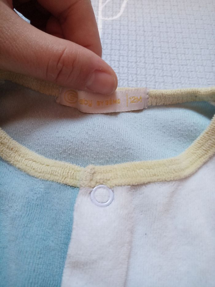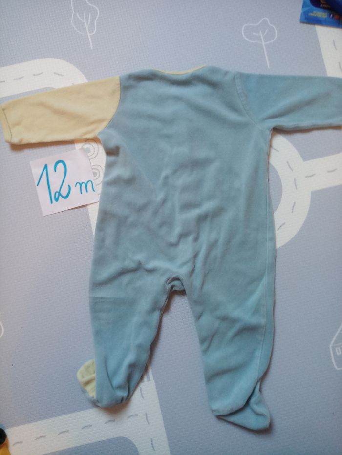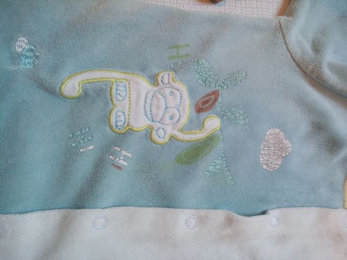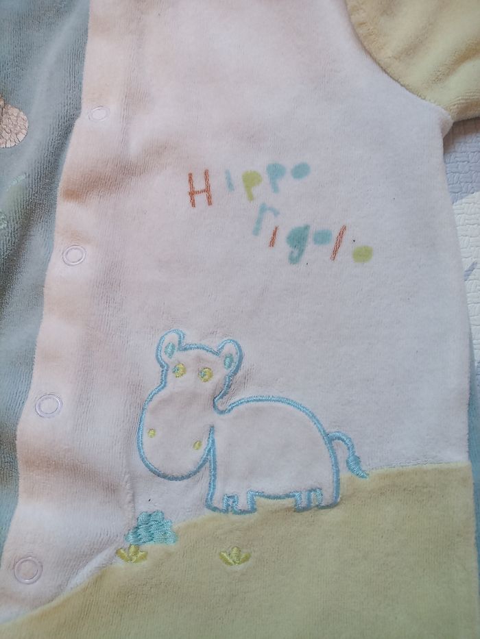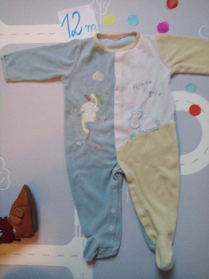 Pyjama type grenouillère en velours, ouverture sur le devant, mixte, brodée singe et hippopotame. Marque G Baby by Gémo taille 12 mois, très bon état général, ni trou ni tâche.