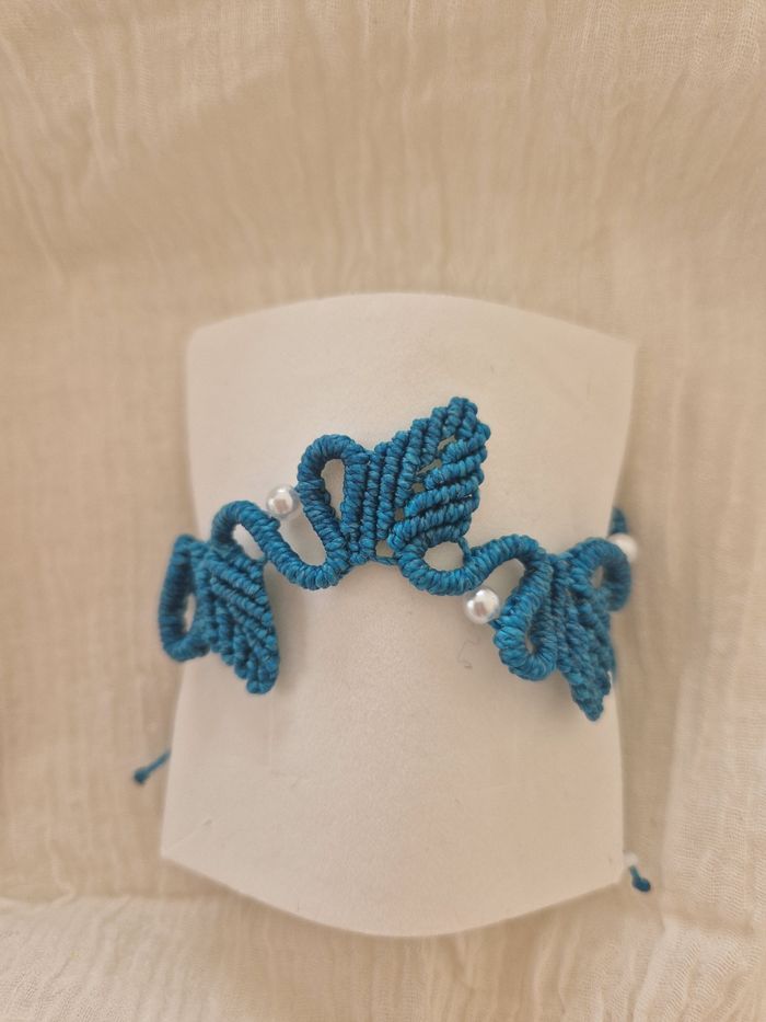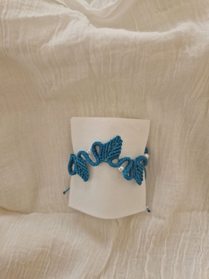 Bracelet en macramé fait main de couleur bleue avec fermoir coulissant qui s'adapte aux poignets de tailles différentes. Jamais servi.