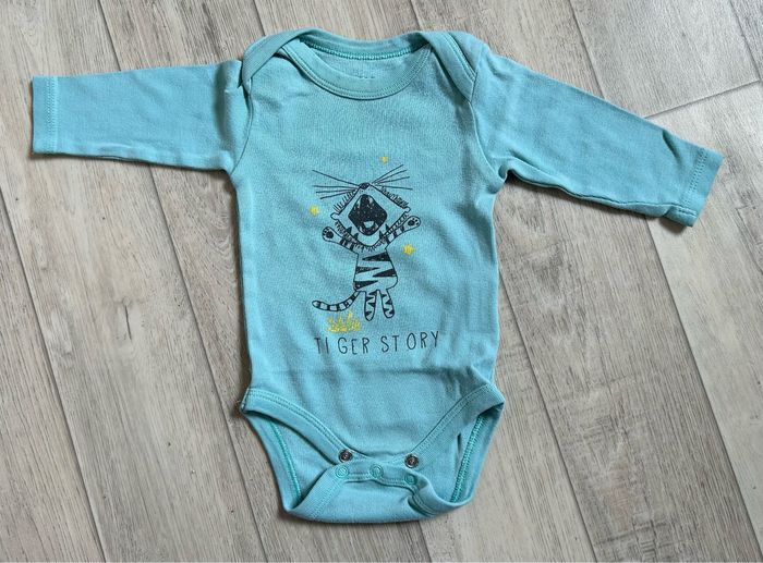 Bodie manches longues de couleur bleu clair avec un motif de tigre en très bon état porté 2 fois maximum. Taille 3 mois Marque : Kiabi Prix : 1 €