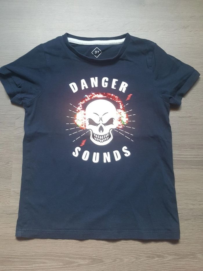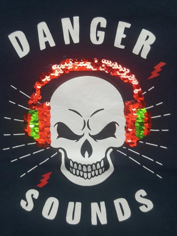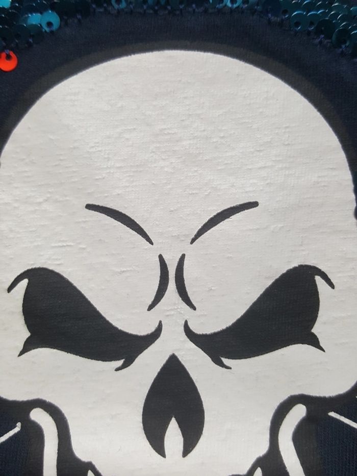 4 - 5 ans T-shirt manches courtes taille 4 - 5 ans. Dessin d'un crâne avec casque en paillettes réversible. En très bon état.